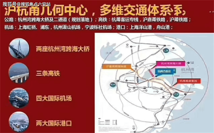 您看到的是长三角地区大区域图,整个杭州湾位于宁波北部,跨海大桥南岸,是上海、杭州、宁波等长三角都市圈的几何中心。规划的沪嘉甬跨海高铁预计2023年通车,通车后可承高铁到上海约40分钟,还有政府在建的杭甬高速复线,这是一条新能源超级高速。时速可达150公里,到杭州约50分钟,最后是宁波方向,目前宁波市规划的轻轨中有一条是至慈溪杭州湾的轻轨,建成后宁波到杭州湾仅需要30分钟,非常便捷。除了陆运交通,周边还有4大国际机场,宁波栎社机场、杭州萧山机场、上海浦东机场、上海虹桥机场,海运当面,上海洋山港、宁波北仑港也是杭州湾发展的巨大优势。