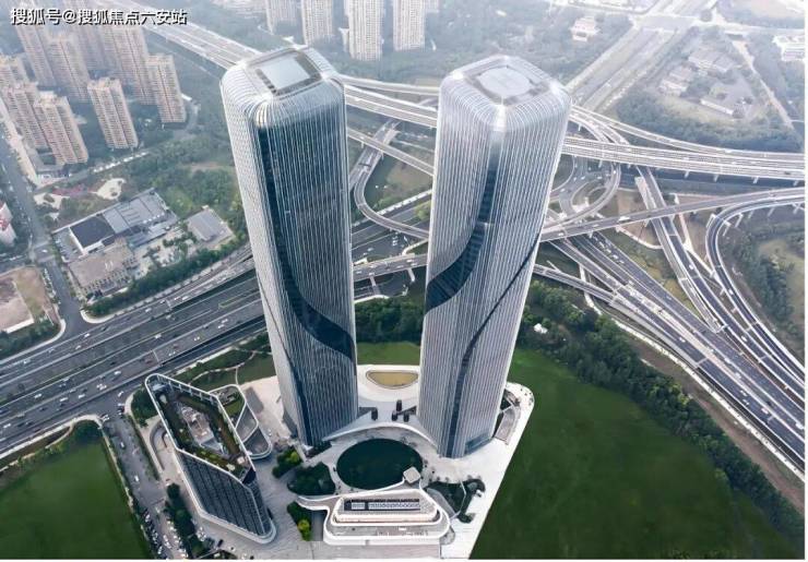双塔以钱塘江潮为灵感,流线型玻璃幕墙如江水奔涌凝结成门,61层天际线勾勒出「数字浪潮」的当代隐喻。双塔底部环绕3000㎡中央绿谷,通过立体退台设计打造「空中绿洲」,让商务与自然在垂直维度共生。夜幕降临时,塔顶智能灯光系统上演「潮汐幻影秀」,以光为笔书写杭城新地标的艺术宣言。