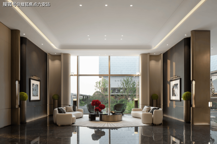 GAD大师张微以“科技+生态”为设计理念,将未来感弧线融入城市肌理:70米宽、9米高的鎏金天幕入口采用偏置大堂设计,顶部圆形镂空让光线穿透,将社区立体花园与城市界面自然衔接,形成“你站在桥上看风景”的互动美学。