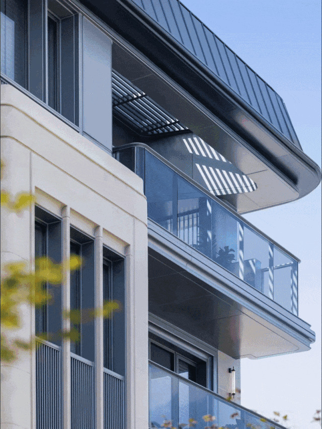 建筑立面采用经典三段式构图,采用米色石材,以及暖色仿石铝板搭配的形式,在转角及细部以精细的圆弧设计,赋予建筑柔和感,同时以景泰蓝奢石线条的点缀,打造当代摩登海派建筑美学。