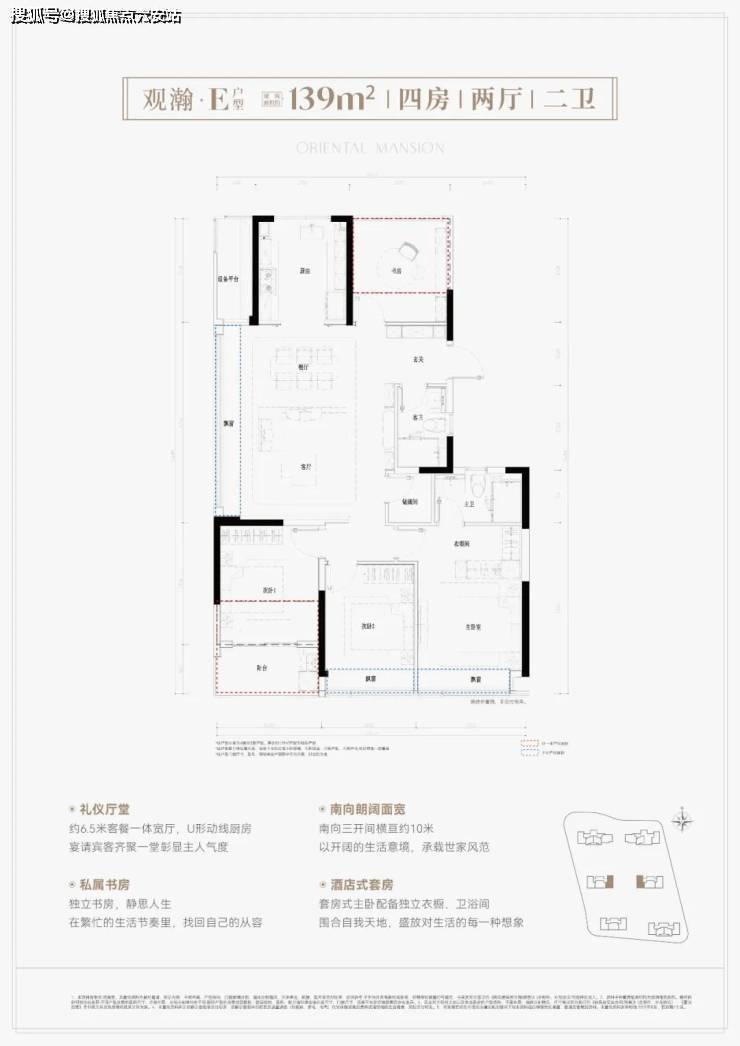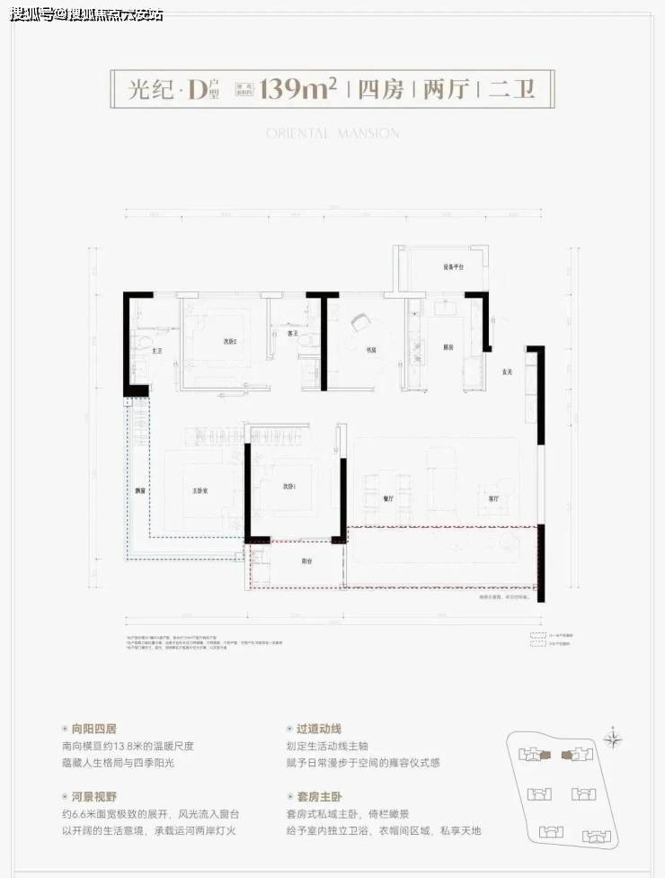 鸣澜里139平户型同样做的不错,打造四房两厅两卫,分为横竖两款,全部为边套,两梯两户设计。其中,139平竖厅户型亮点分析:①户型得房率超高,达到约93%;② 南向3个卧室,采光优且满足二胎家庭和三代同堂居住需求;③ 客厅面积达到约37平,足够大,同时额外配置约2.6平的储物间。