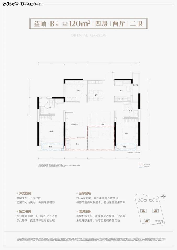 建面约120方户型:这款户型设计非常不错,在这个120方的面积段里不仅做了四房设计,而且还是四开间朝南,南向采光非常好。
