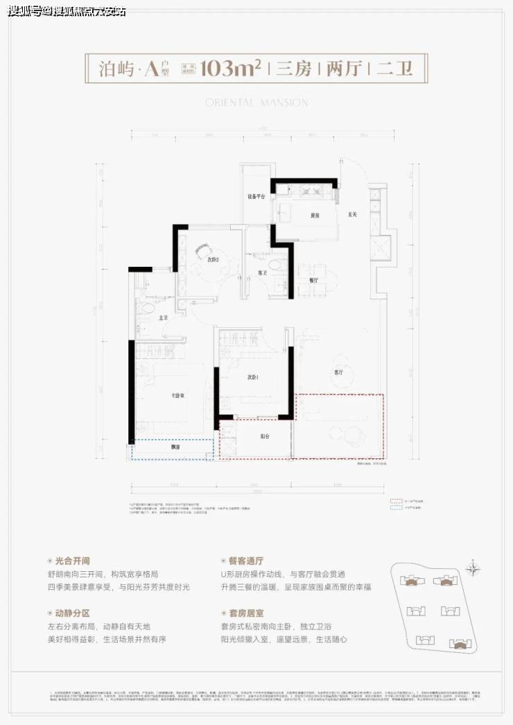 建面约103平,三房两厅两卫。三大亮点分析:① 南向三开间,朝南次卧带阳台,客厅联通阳台后,空间阔绰;② U型厨房且半开放设计,玄关含S墙冰箱位,利用率高、采光更优;③ 新规户型得房率高达约90%以上。