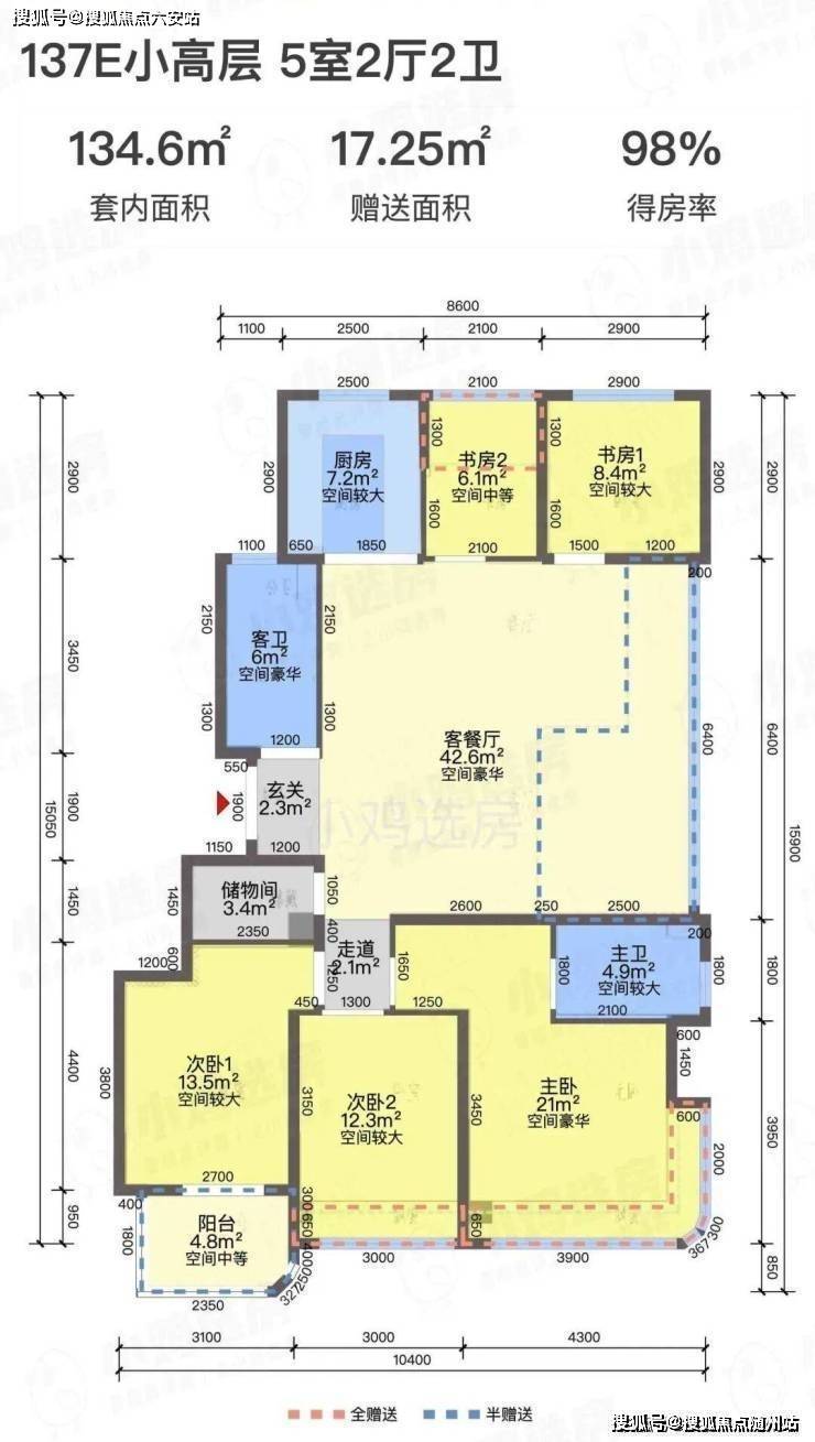 亮点:得益于新规,得房率约98%,实现五房布局,功能性强。