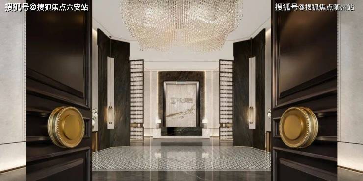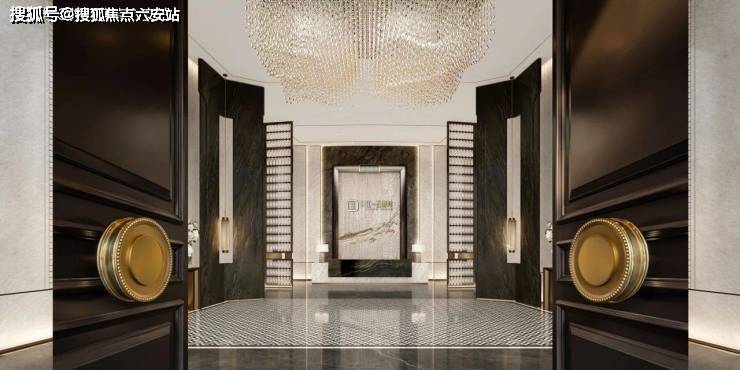 当中,商业大户型主力面积约360㎡,层高约4.2米,并配置两梯一户的独立电梯厅。从首层大堂步入,超大水晶吊灯高悬,墨色石材墙面纹路氤氲,地面则是繁复的大理石拼花,一派高门华屋的气势。