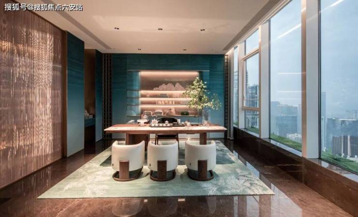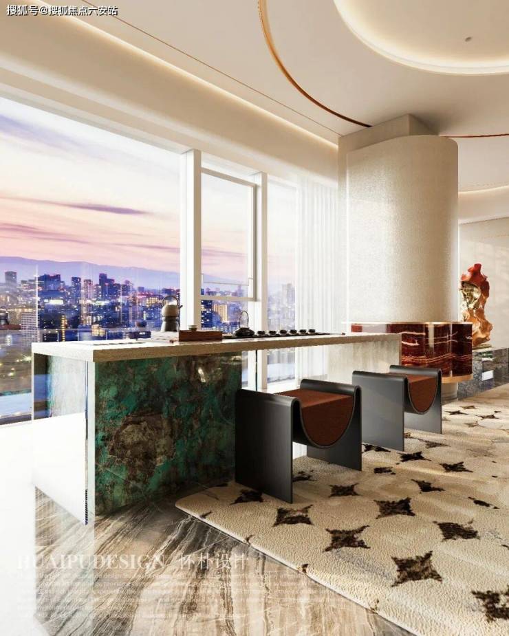 边上的品茶区,青绿石纹如远山叠翠,与鎏金小凳的贵气相融,让东方茶事有了当代的表达。落地窗将城市天际线框成动态的画,煮茶时,看云卷云舒,观城市流转,尽享独属于云端生活的浪漫。