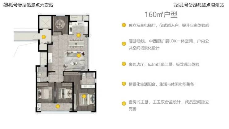 本项⽬楼王产品为198平⽶全景观江的端厅⼾型,通过南向阳台、东向飘窗的组合,使客餐厅区域获得了270°的全景观江视野。