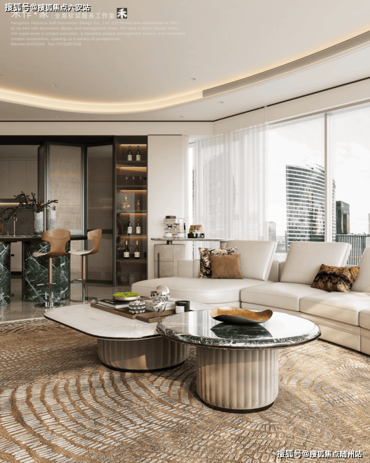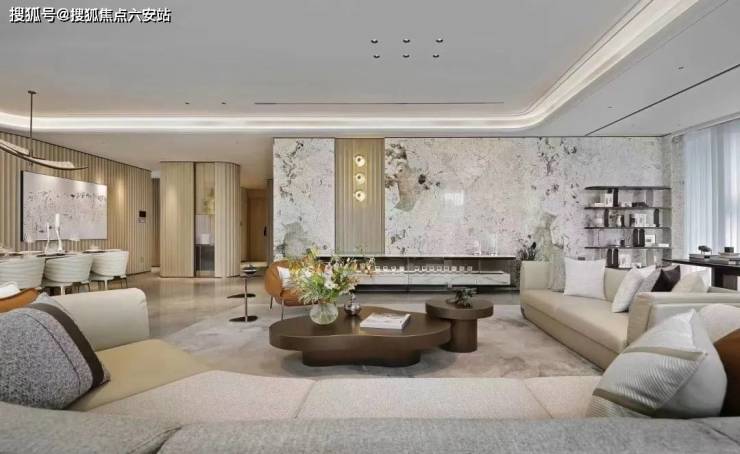东区建面约320户型,将艺术感进一步融入日常中。特别设计的专属门厅空间,是从电梯厅延伸到家,如同一处艺廊,放慢人的情绪;室内选用了浅金色奢石(外界也称其为“芬迪白大理石”)作为主要的石材,曲面的木饰面也为浅色,整体给人以明亮感。