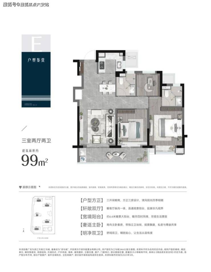 建筑面积约99㎡做到了三房两厅两卫,约9.9米南向三开间,约6.6米阔绰观景双阳台,这样的尺度,北仑罕见。从大开间的一体双厅,足够容纳一大家子人欢聚的时光,到独立套房主卧,私享独立卫浴、观景飘窗,轻松营造私密的浪漫境界,这般突破规制的尺度创新,正是滨江天街|江与城持续劲销的内因所在!