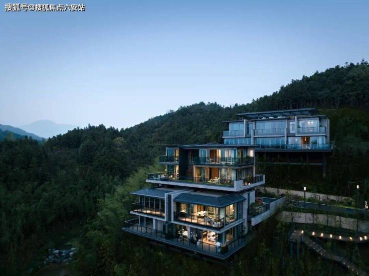 建筑以灰色人造石材、铝板与大面玻璃幕墙构筑,如“山间水晶盒”般折射环境光影,玻璃占比超60%,270°环景露台与星空露台打破室内外界限。每栋建筑依山就势定制朝向,实现“每一栋皆定制,每一境皆不同”的独特视野。