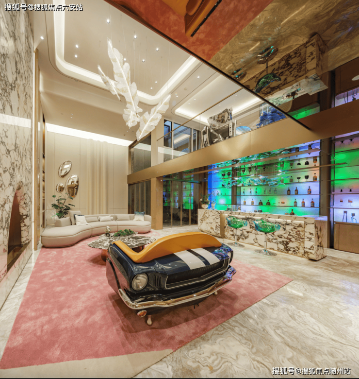 项目以宋代建筑美学为蓝本,融合现代工艺与材质,打造“新中式顶豪标杆”。外立面采用伊朗进口“蓝眼睛”奢石、香槟色铝板及大面积落地玻璃,既保留宋式飞檐的古典韵味,又通过现代材质提升耐久性与视觉冲击力。建筑细节上,三重屋檐象征“天地人合一”,汉白玉抱鼓石、300年古珊瑚枫等珍稀元素的应用,复刻了宋代园林“四水归堂”的意境。