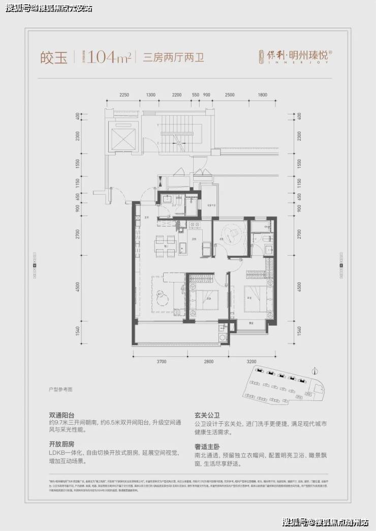 104㎡三房两卫:三开间朝南+6.5米双阳台,玄关公卫设计提升实用性,LDKB一体化餐客厨空间,首付1.5成仅需约45万,刚需改善首选;
