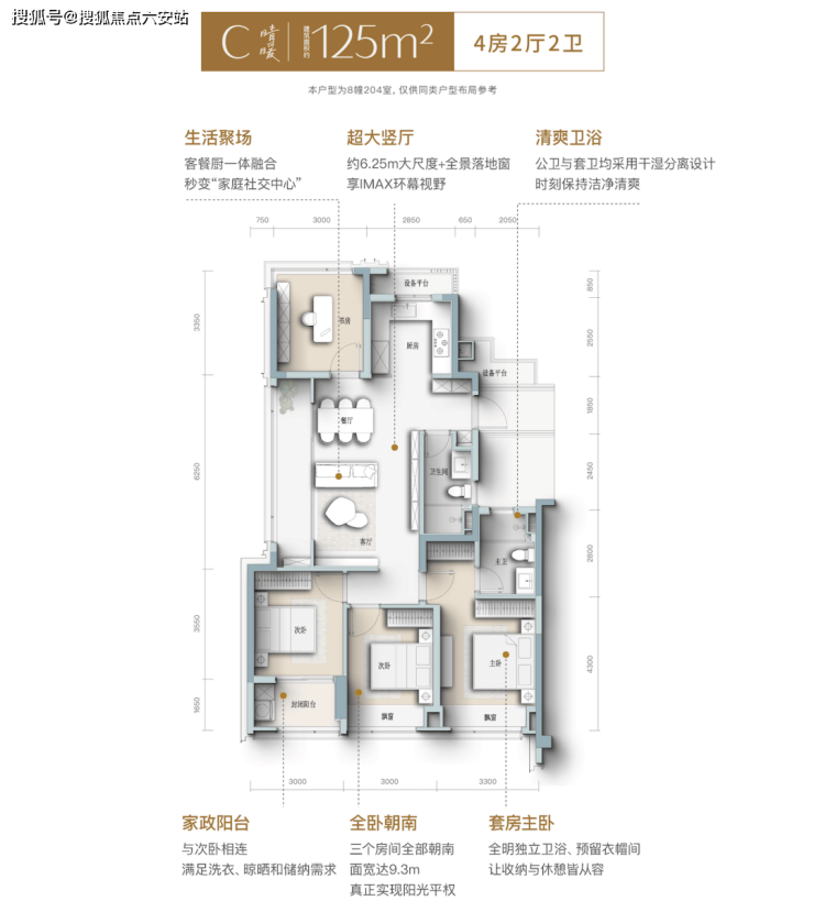 约9.3m南向面宽,全卧朝南,让每一室均享阳光的平等眷顾;