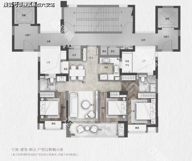 洋房169户型:一梯一户、独立归家前室、、全明电梯厅、中西双厨、南向双套卧、主卧L形飘窗、双台盆、双衣帽间