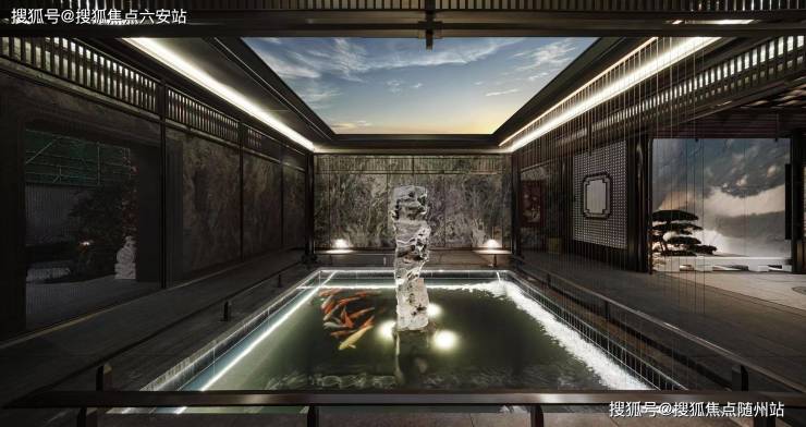 在四水归堂中,墙面铺的是巴西进口奢石“璀璨年华”,锦鲤池中立着一块虎牙桀立的太湖石,用了近100吨原生太湖石,并取意金沙之水天上来,寓意将滚滚财源汇聚一堂。