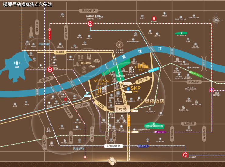 地理占位:项目位于杭州萧山区钱江世纪城奥体核心区,与钱江新城合称“杭州CBD双核”,毗邻地铁2号线飞虹路站,是TOD上盖项目,地铁出口直达地下室。