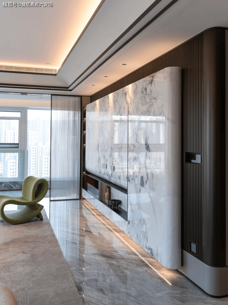 这是一套五房四卫的设计。步入玄关,大面积的直纹白玉和铜丝皮革组成的玄关背景,搭配富有禅意的软装和灯光,组成一幅绝美的3D壁画。玉石自然价值不菲,这个铜丝皮革用的是人工编织的铜丝,手感顺滑,当然它的价格也矜贵。