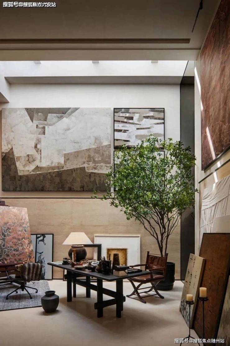 负一层至夹层打造垂直艺术核心区域,油画工作室、围炉品酒区、作品展廊等自由串联。