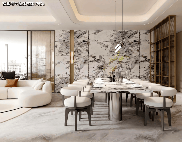 餐厅与客厅空间相贯连,开阔的视野带来惬意与更具互动感的用餐氛围。精巧工艺与大理石水墨画般的自然纹理交相叠映,镜面光泽,熠熠生辉,每一处细节都彰显着对品质生活的极致追求。