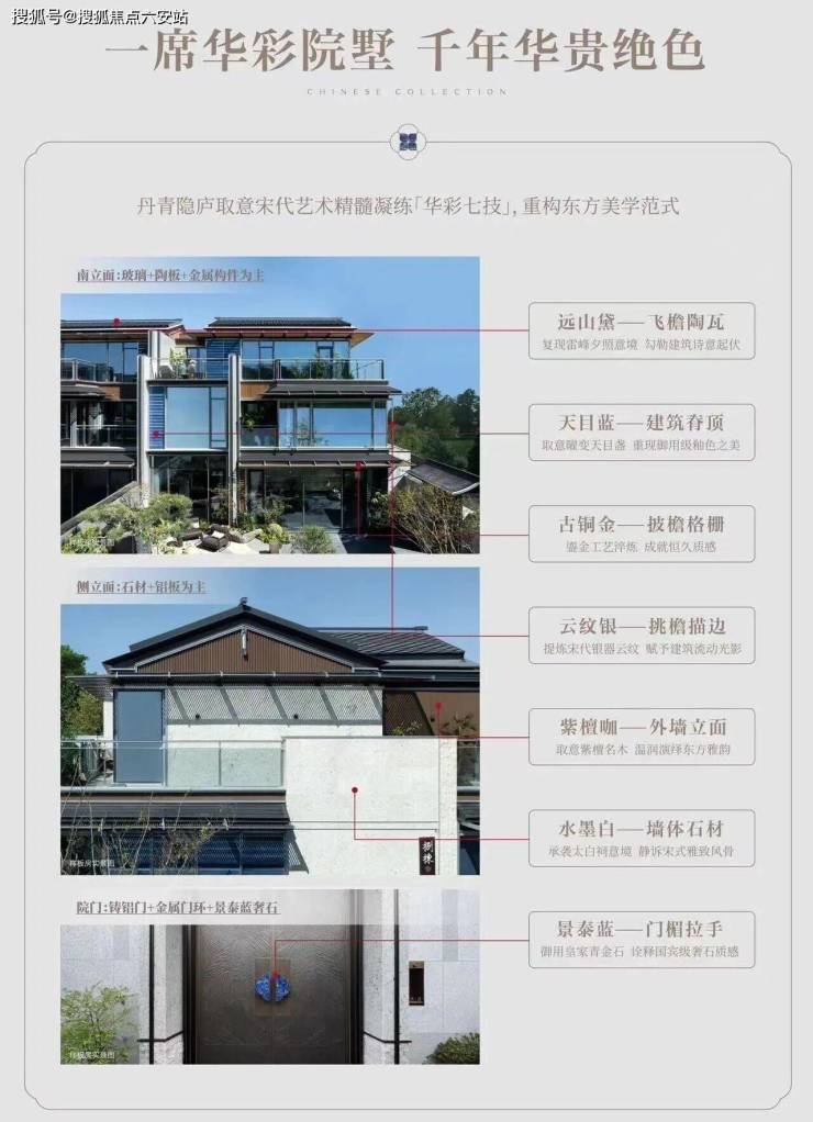 ❍披檐格栅-淬火古铜金:源自经典鎏金工艺,带来观感和触感的恒久之美。❍外墙立面-繁星紫檀咖:取意满天星紫檀名木,温润厚重的暖调诠释东方雅韵。❍墙体石材-丹青水墨白:承袭丹青水墨空灵之美,静诉千年宋式的泼墨风骨。❍门楣拉手-御制景泰蓝:还原御用珐琅彩景泰蓝,诠释国宾级奢石质感。