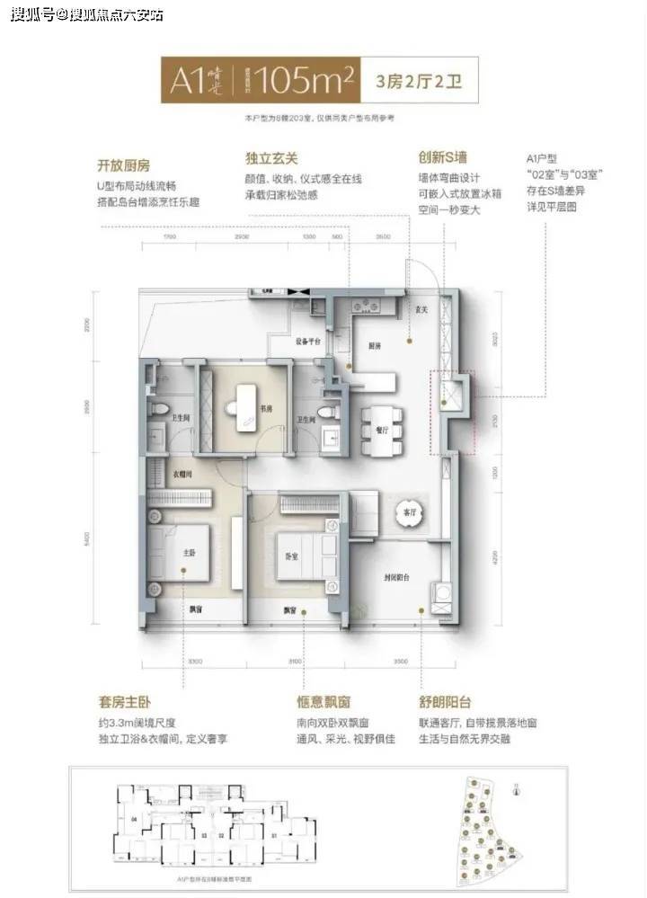 奢阔三房(约105㎡):专为城市新锐家庭设计,南向双联阳台连接客厅与次卧,采光面宽达约10.8米,三间卧室全明设计,U型厨房动线流畅,是品质生活的入门之选。
