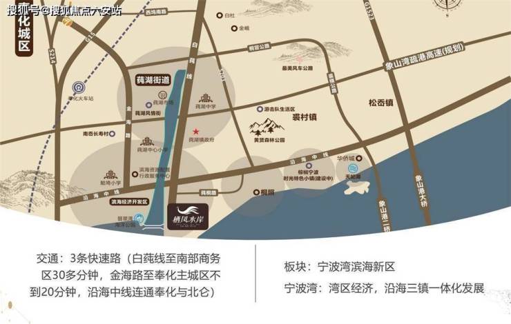 栖凤水岸项目位于莼湖镇栖凤村翡翠湾海洋公园附近,产品涵盖洋房、联排、双拼、叠墅、商业街区等。地段上近海靠河,自然环境非常优越,配套上项目自建近1.6万方的商业街区,街区内配套有大型超市、菜场、宴会厅等各种商业体,配套上非常完善,交通方面周边现有多条快速路,20分钟可达奉化中心城区,10分钟可达天妃湖旅游度假区,15分钟可达黄贤国家森林公园,交通非常便利。