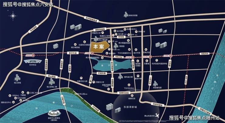作为杭州“城市之眼”,金沙湖以464亩湖体面积、热带风情景观与完善配套,早已成为城东的“国际化生活湖区”。绿城湖映金沙轩落址金沙大道与松合路交汇处(下沙西站地铁口),正是金沙湖核芯CBD的“黄金C位”,既享湖景稀缺性,又握城市便利度。
