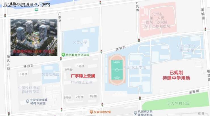 🏥医疗:3公里范围内2家三甲医院:邵逸夫医院下沙院区、浙江省中医院下沙院区。项目东北侧更有零距离杭州市第一人民医院下沙分院。