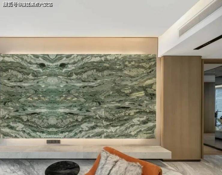 意大利卡拉拉原矿的多款大理石,奢侈地漫铺于地面和墙面上,公区背景墙则采用巴西进口石材天宝石,纹理与色泽好似青绿山水,质地却温润如玉,正是观云钱塘城的同款。