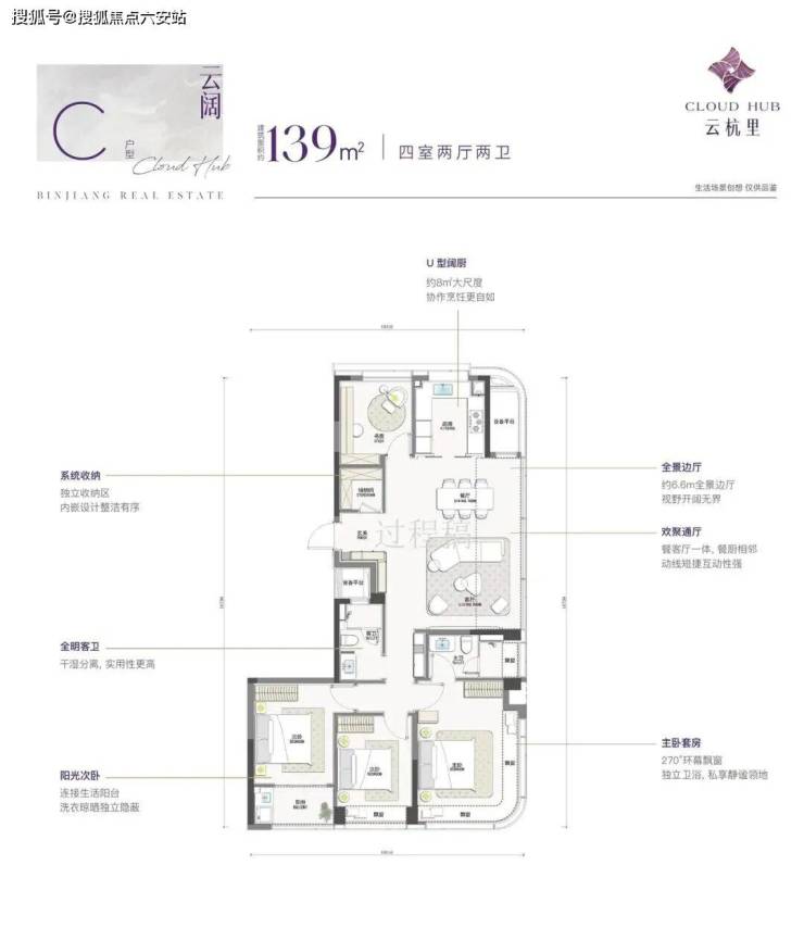建面约139方4房2厅2卫边套,实得率约91%,布局“优秀”。全封闭式阳台,三面采光,观景视野无敌。