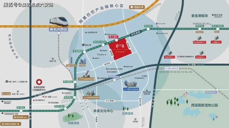 项目亦位于杭州极具创新活力的未来科技城核芯区域。其为地铁5号线永福站上盖,直线距离火车西站4公里,距西溪湿地4公里,距离阿里巴巴集团总部2公里。周围住宅氛围浓郁,办公已成规模,商业配套齐全。