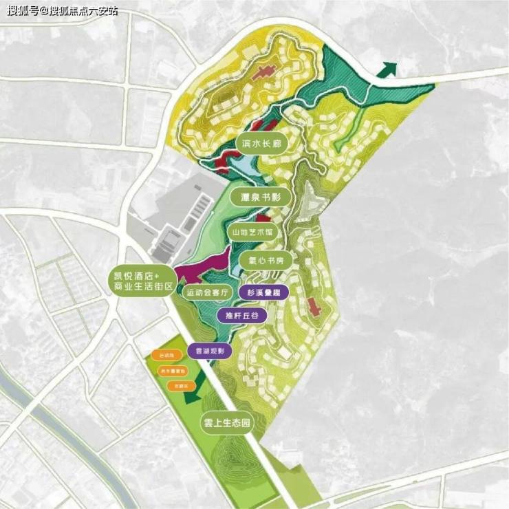 观雲全域整体由“三脉会两谷”势态,两座湖泊掩映、三面密林环抱、山涧溪流穿过,“一园、一轴、五享、五心、六雲”层次点缀,尽享自然天趣,俨然一处世外桃源之境。