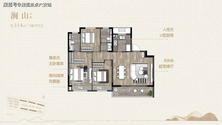 建面约114㎡洋房户型,三开间朝南,户型方正,南北通透;约6米宽横厅设计,有效拓宽了居住空间;宽景阳台设计,融合了功能性与观景性的双重功能;南向卧室带飘窗设计,采光好;主卧套房设计,有效保证了主人的私密性。