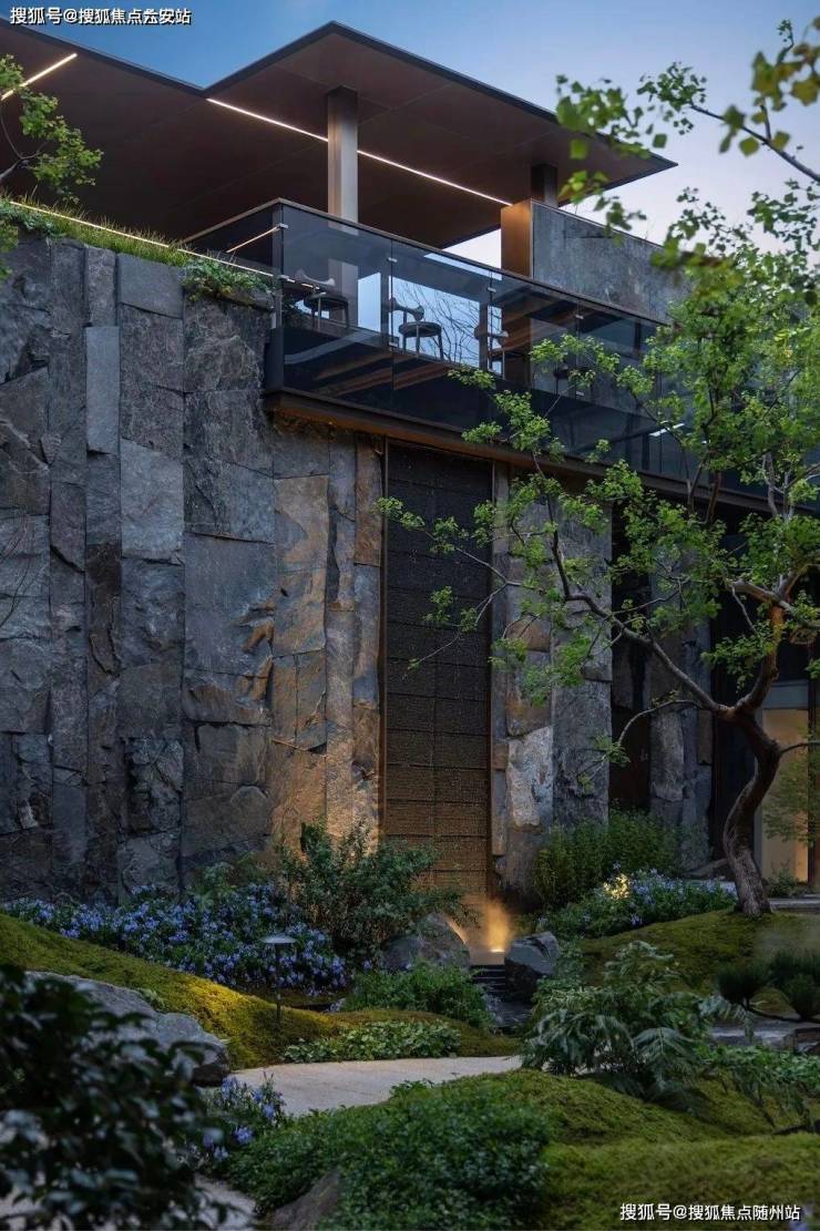 会所入口还采用了和观雲钱塘同款的柏坡黄石材打造迎宾景观,与罗汉松互相映衬。进入示范区后,古朴雅致的下沉式庭院便豁然眼前。昂贵的黑松和羽毛枫分立两侧,四角是设计师精挑细选的乌桕树,中间叠水曲折辗转,宛若自然秘境。