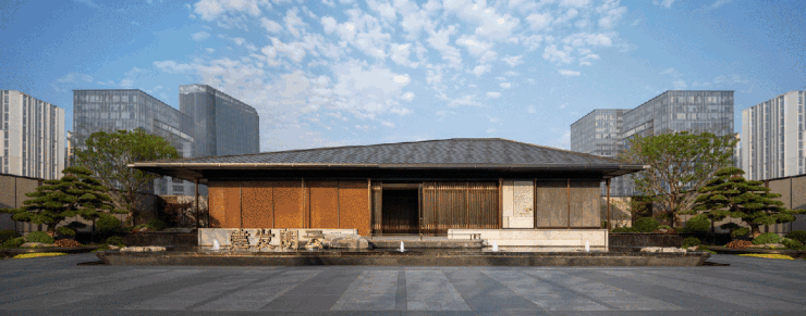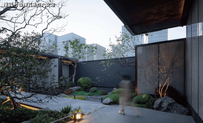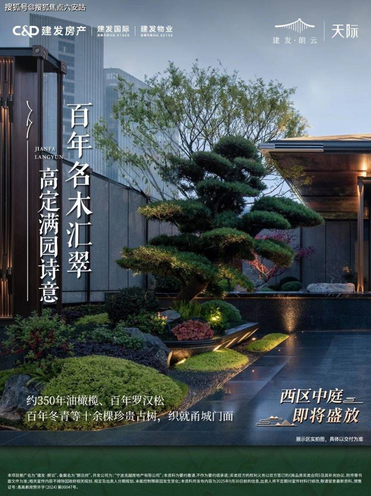 顶端的中式飞檐,东方建筑美学融入现代审美。.承“诗意东方”造园理念,以“一轴三进三重境”的景观布局手法,于一方园林天地,造一幅东方巨幕山水诗意画卷.建发·朗云沿袭中国传统归家礼仪,打造三进府院礼序空间.一进·云松迎客,大门总体面宽约60米,高约8.35米,门口五级台阶寓意九五至尊,星级酒店标准的大堂.迎客罗汉松、龙鳞池壁、鱼鳞纹步道