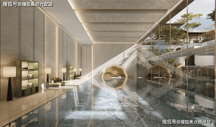 雲润宸庐的约2000㎡中央会客厅,融合书吧、茶室、儿童游乐区等功能,意图构建有温度的“宋韵社群”。整个会所围绕落差超9米的中庭展开,以西湖郭庄为范本,再现了“水、石、松、廊、桥、亭、轩”等经典元素。