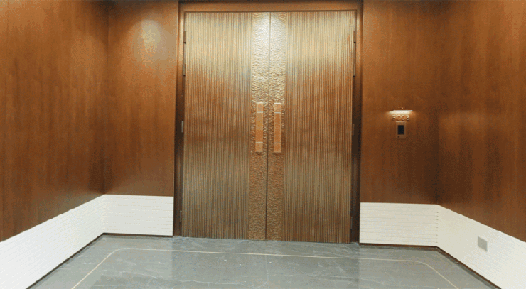 门厅一路之隔为地下车库入口,两侧的贝特白石材与门厅的立柱形成材质呼应。金摩卡石材墙面内嵌软膜灯槽形成节奏感持续向前,坡道地面精选防滑地坪漆刷就。车库内部,顶面大体量雕刻装饰铝板、金色铝板立柱扑面而来,于繁复的意向中不断强化豪宅区的氛围感。