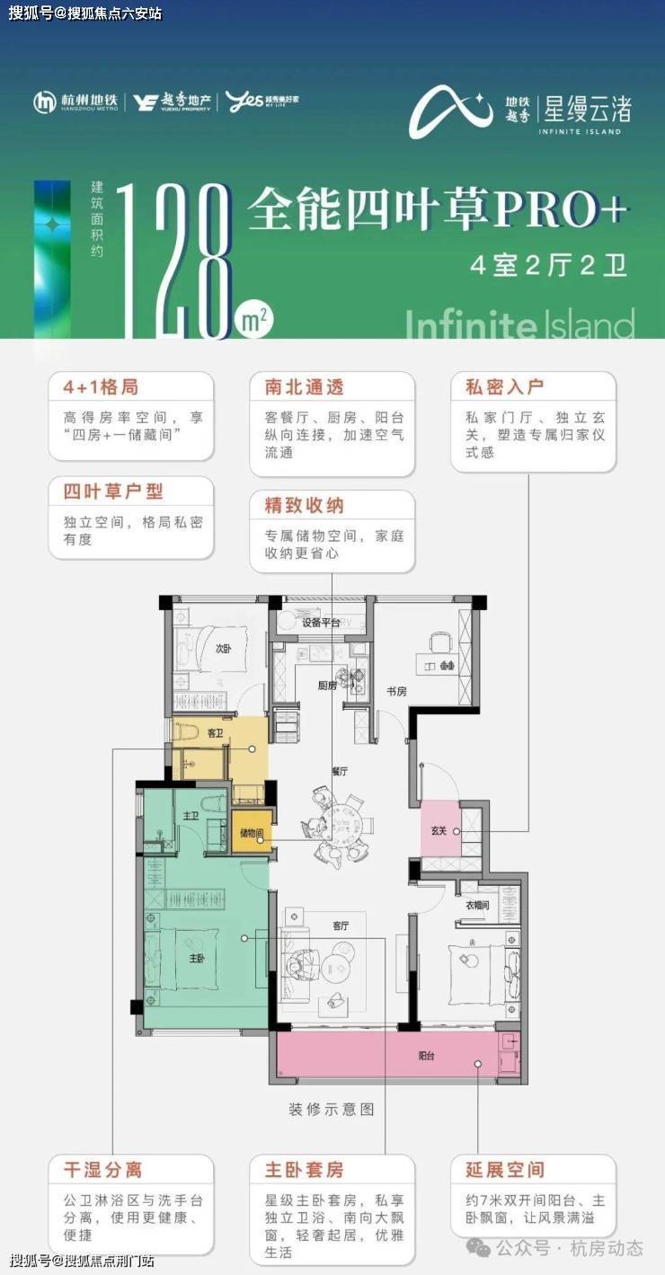 建面约128㎡户型为四房两厅两卫,该户型最大亮点是超高的得房率,也是最受市场欢迎的“四叶草”户型,四个卧室互不打扰,充分保证后期的生活隐私。户型尺度上也同样阔绰,近7米的双开间阳台,2.7m宽的U型厨房,每一个小空间内都可以承载很多的生活场景。