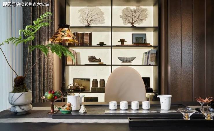 在茶室,设计师选用木美MaxMarko品牌,中式圈椅造型美学辅以天然皮革材质,温润的大理石结合古韵实木,古朴典雅又符合现代美学,在不同材质的碰撞中,探讨当代茶与生活方式的融合。一抹绿意伸展,袅袅烟影落于晴窗,私藏一隅东方雅韵,阅尽书籍的历史厚重感,在茶香与墨香中沉淀生命诗意。