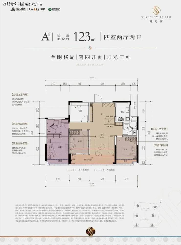2. 户型革新:123-173㎡全四房设计,得房率88%-90%,139㎡横厅户型南向面宽13.85米,173㎡楼王配备星空露台与双套房。