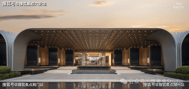 棠悦芳华轩大门实景:萃取东方礼制精髓,沿东西向主轴设置多重归家院落,形成主入口至迎宾水院及度假水池为一体的礼序归家轴。层层递进的空间,在步移景异中,营造出多重归家仪式。