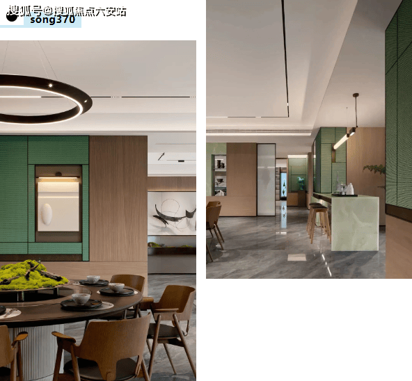 最后是精奢于心的优雅空间,例如由琚宾设计的杭州首个宋韵作品「SONG370」,提取经典名画《西湖全景图》中的丹青意蕴,运用风景开阖、空间对比等传统设计手法,从青玉横幅背景墙到金缕编织墙面