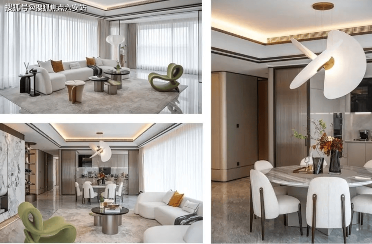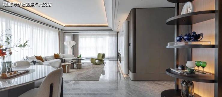 室内空间则以“全球奢石博物馆”为理念,芬迪白、喜马拉雅灰、雪山蓝等20余种进口名石贯穿全屋,主卧吊顶融入弧形波浪元素,营造“复古与摩登共生”的沉浸式艺术体验。