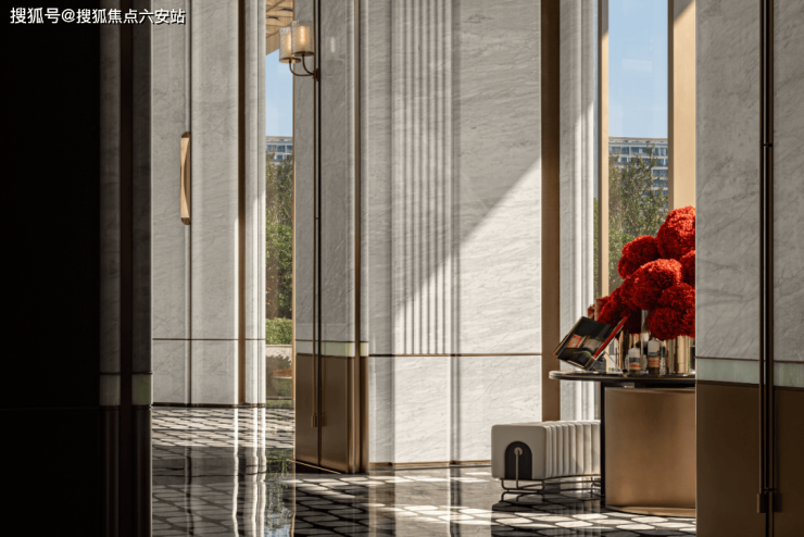 走近项目,约85米超级画幅门厅的第一笔,飞扬在高约9.5米的领域感门头之上,搭配鎏金天幕铺陈,营造出精致、轩昂、高级的华宅氛围。归家的第一眼,便是一场视觉盛宴——门头以流畅的弧线勾勒现代美学,鎏金材质在阳光下折射出奢华光泽,仿佛一座微型艺术殿堂。