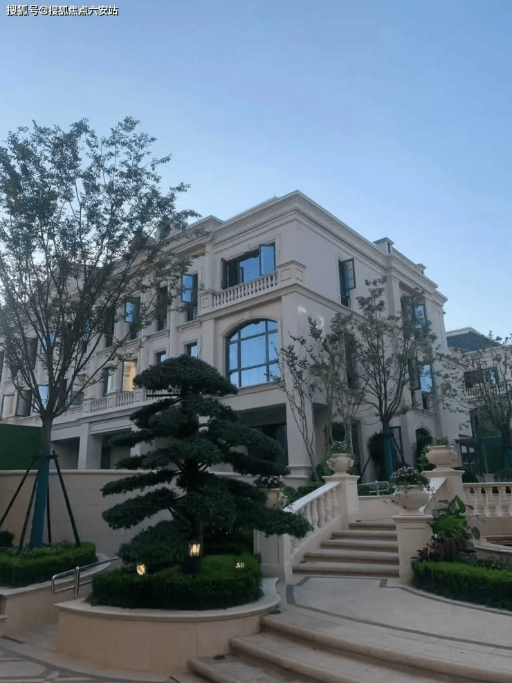 整个园区,以经典的绿城法式墅区景观大中轴贯穿,占地约1000多㎡,联排建筑的设计,融合了中国传统院落布局与法国枫丹白露宫的审美,外立面大面积采用全石材干挂,檐口等细节部位使用仿石。