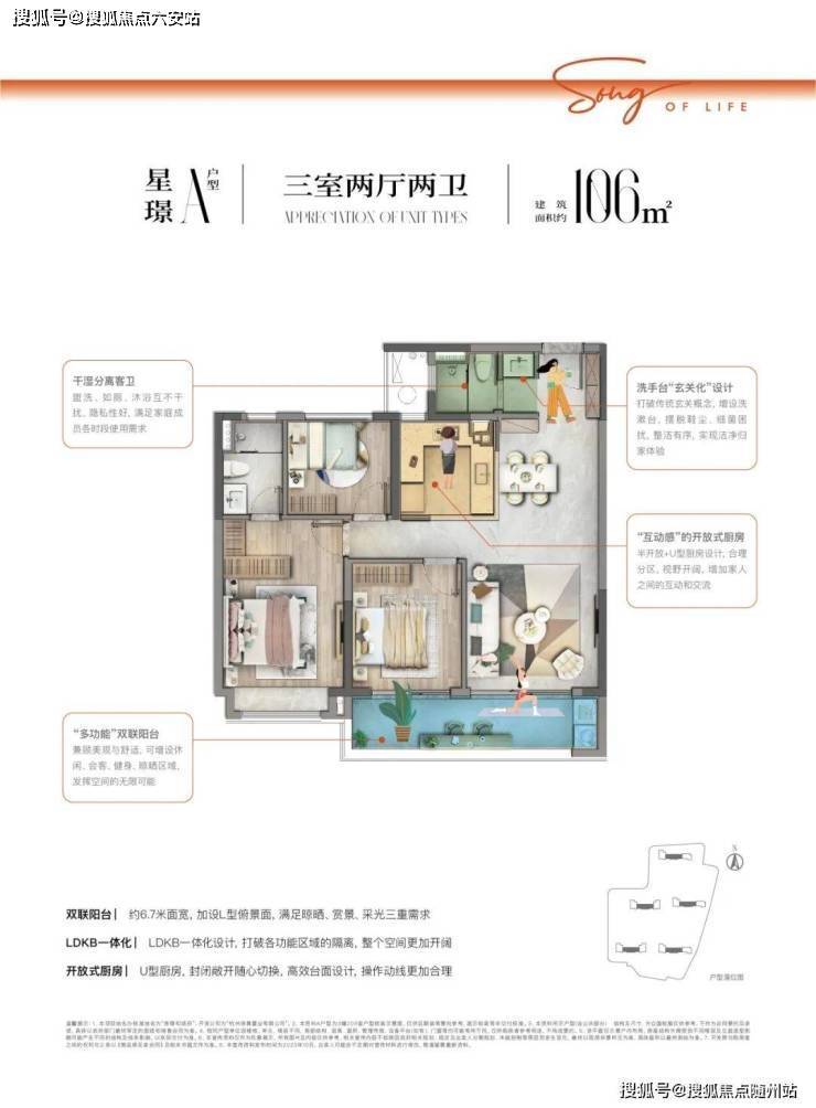 约106㎡户型点评:双联阳台约6.7米面宽,加设L型俯景面,满足晾晒、赏景、采光三重需求,LDKB一体化设计,打破各功能区域的隔离,整个空间更加开阔,开放式厨房 U型厨房,封闭敞开随心切换,高效台面设计,操作动线更加合理