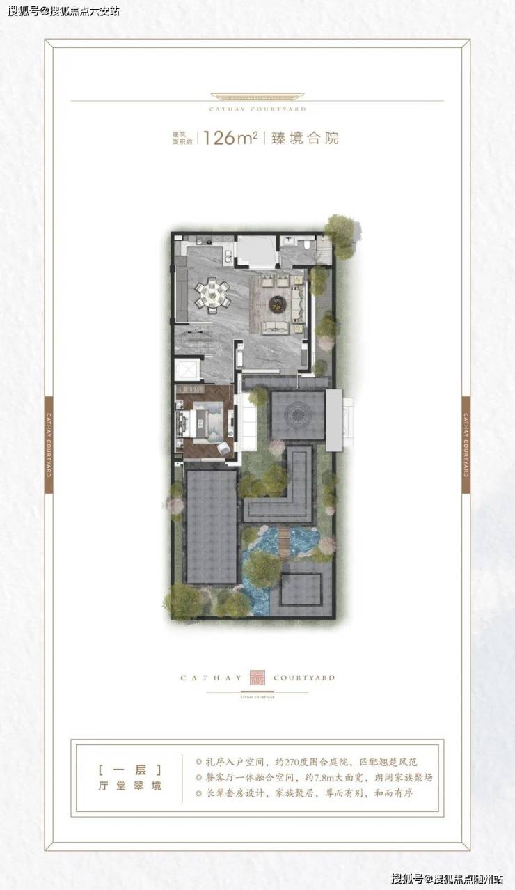 在建面约126㎡合院户型中,270°三面环绕的围合式布局,拥有大大小小三个花园,将客厅与庭院融为一体,庭院空间可以做成丰富的私家园林景观。