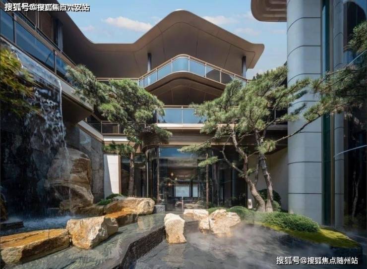 项目园林设计以“西湖古典园林之冠”郭庄为蓝本,通过水、石、松、亭、轩、瀑、桥等园林符号,构建三重自然东方意境。约43米恢宏门庭,两侧黑松耸立,营造尊崇归家礼序。最具特色的是三层观景式下沉庭院,以北宋范宽《溪山行旅图》为范本,打造立体山水长卷。院内太行金石层层堆叠,14米高差设计,形成层次丰富的景观效果。