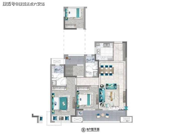 户型动静分离,休息区集中。主卧为套房设计,预留衣帽间和独立卫生间,同时赠送飘窗,兼具居住的舒适度和私密感。北面还有一个小房间,灵动空间可以设计成书房或者茶室,可根据业主实际需求自由切换。