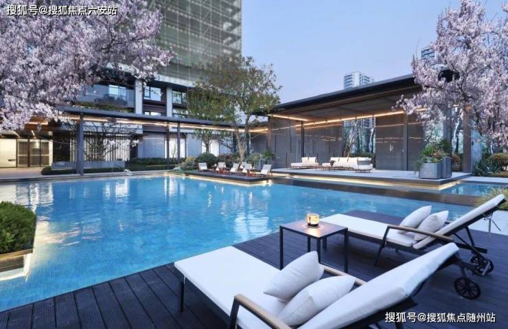 水的粼动,光的应和,伴随着水中樱花树的造景,以及池底冰川蓝马赛克的丰富色彩搭配,让整个场景的气质更加惬意、缤纷,仅是静静的欣赏这一片水面,就能沉浸于丰盈的情绪和感观之中,遐想未来的美好生活。